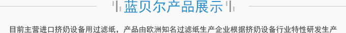 濟(jì)南藍(lán)貝爾工貿(mào)有限公司主要產(chǎn)品擠奶設(shè)備過(guò)濾紙,牛奶過(guò)濾紙,擠奶機(jī)過(guò)濾袋,目前主營(yíng)進(jìn)口擠奶設(shè)備用過(guò)濾紙,產(chǎn)品由歐洲知名過(guò)濾紙生產(chǎn)企業(yè)根據(jù)擠奶設(shè)備行業(yè)特性研發(fā)生產(chǎn),產(chǎn)品符合歐盟食品接觸標(biāo)準(zhǔn)及FDA食品接觸標(biāo)準(zhǔn),產(chǎn)品在擠奶設(shè)備過(guò)濾紙行業(yè)占有70%以上的份額。并通過(guò)了SGS標(biāo)準(zhǔn)技術(shù)檢測(cè)中心按國(guó)標(biāo)食品級(jí)標(biāo)準(zhǔn)進(jìn)行的檢測(cè)。產(chǎn)品適用于各種擠奶設(shè)備品牌,本公司目前獲得該區(qū)域產(chǎn)品營(yíng)銷(xiāo)資格。產(chǎn)品已用于國(guó)內(nèi)各大乳企所屬牧...